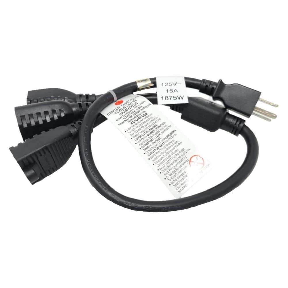 Connector types: NEMA 5-15P to NEMA 5-15R (x3). 14 AWG conductors. Voltage rating: 125-Volt. Amperage rating: 15 Amp. Temperature rating: 75°C/167°F. Split 1 NEMA 5-15 plug into 3 NEMA 5-15 receptables. Ideal solution for eliminating extra bulky cords and reducing clutter. This heavy-duty 14 AWG power cord is fully molded for durability. UL, cUL Listed and CSA approved.