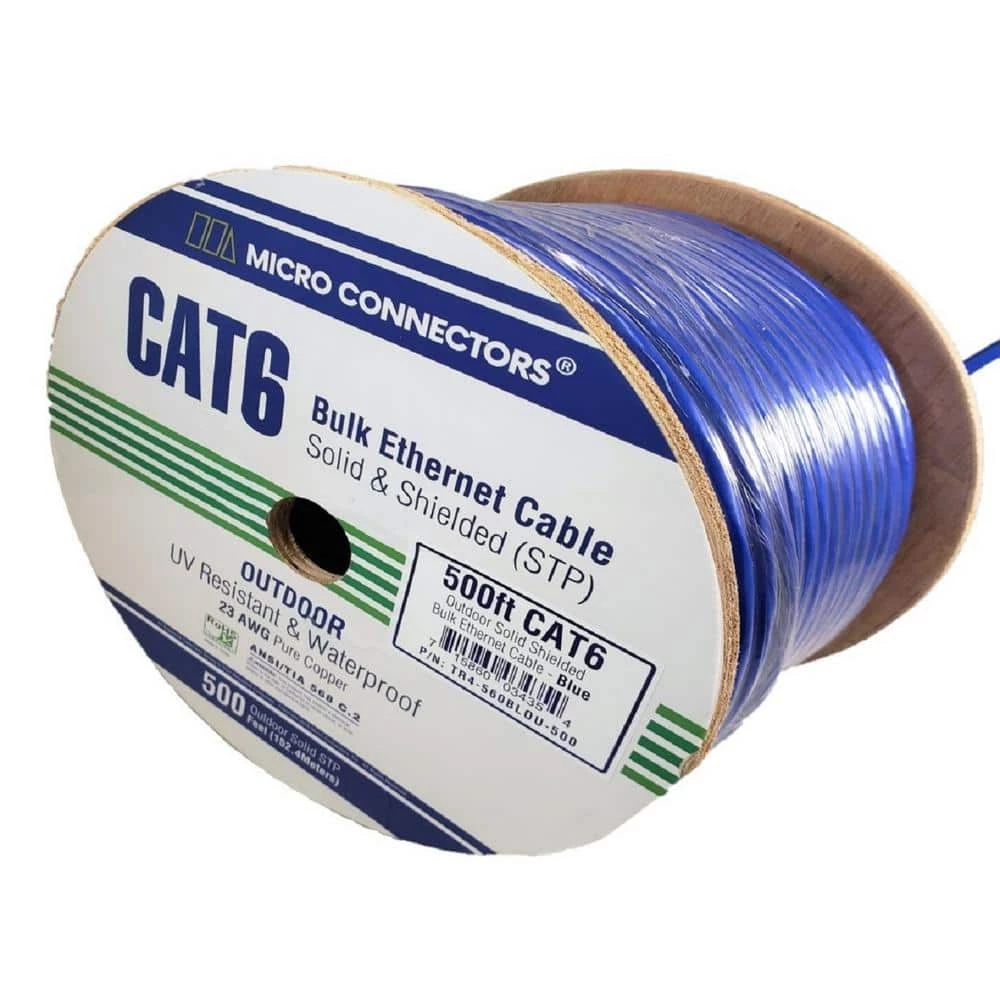 The Micro Connectors Cat 6 Solid STP bulk Ethernet cable is perfect for your office of warehouse cabling project.Our cable allows for maximum performance while minimizing electromagnetic interference/radio-frequency interference (EMI/RFI) and almost eliminating alien crosstalk (AXT).Suitable for fast, Gigabit, and 10-Gigabit Ethernet and supports bandwidths of up to 550 MHz.