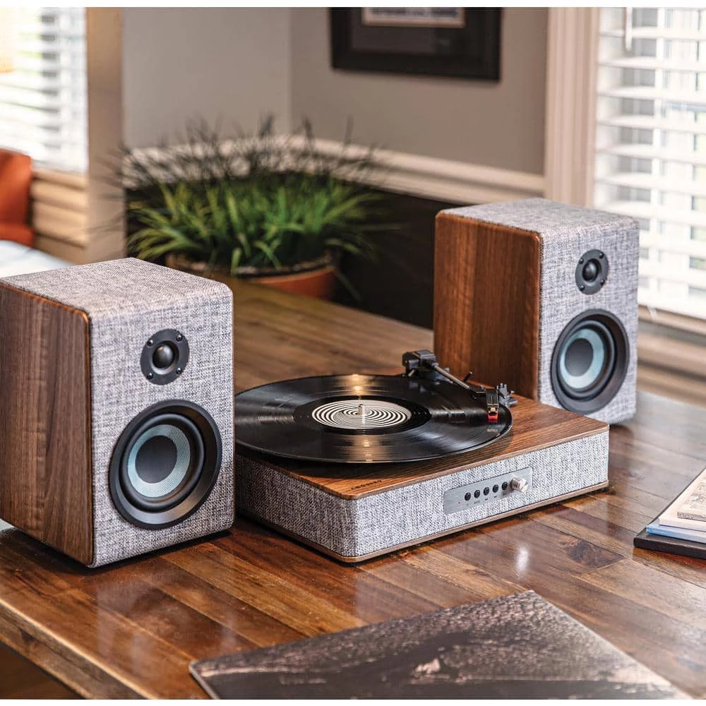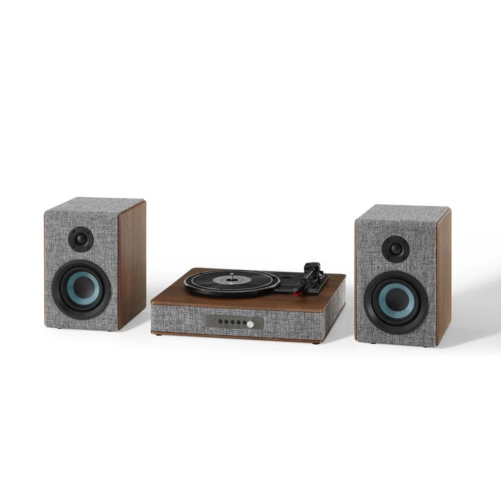They say clothes make the [wo]man, but in this case, they also make the stereo. Outfitted in eye-catching heather grey fabric accented with walnut wood and silver accents, the Aria Shelf System is definitely dressed for success. The Aria is more than just a pretty face, though: the three-speed turntable boasts a built-in Bluetooth receiver, FM radio and aux input and the speakers deliver 2×25 watts of sound. Stunning looks and personality to match. We’re absolutely swiping right on the Aria Shelf System.