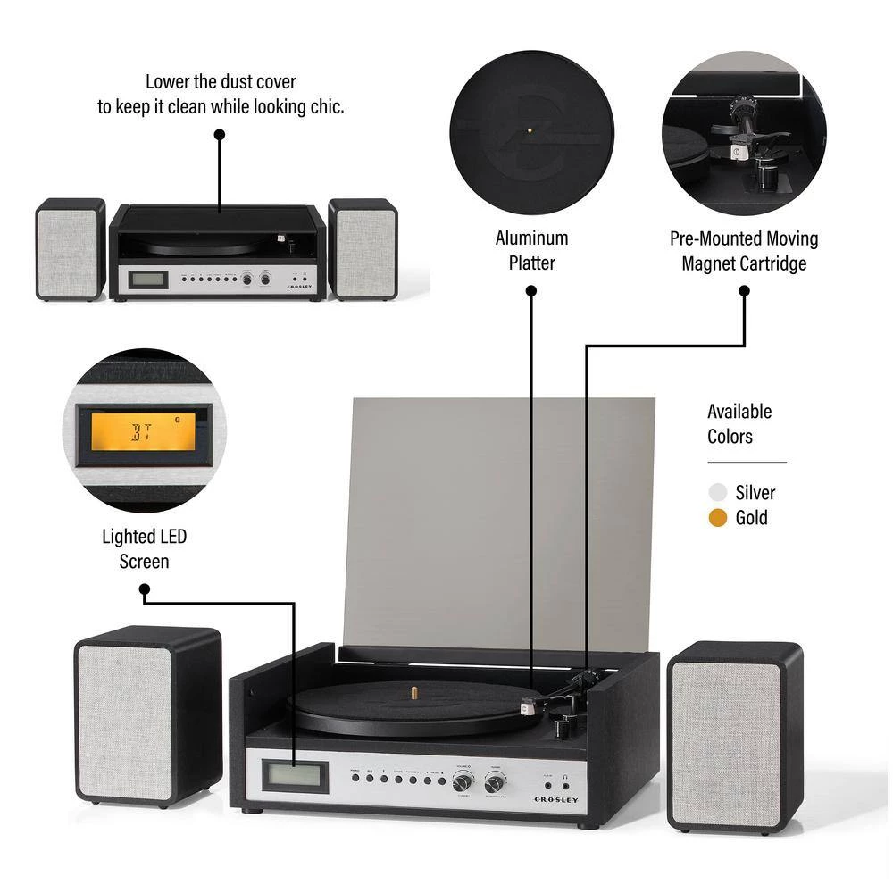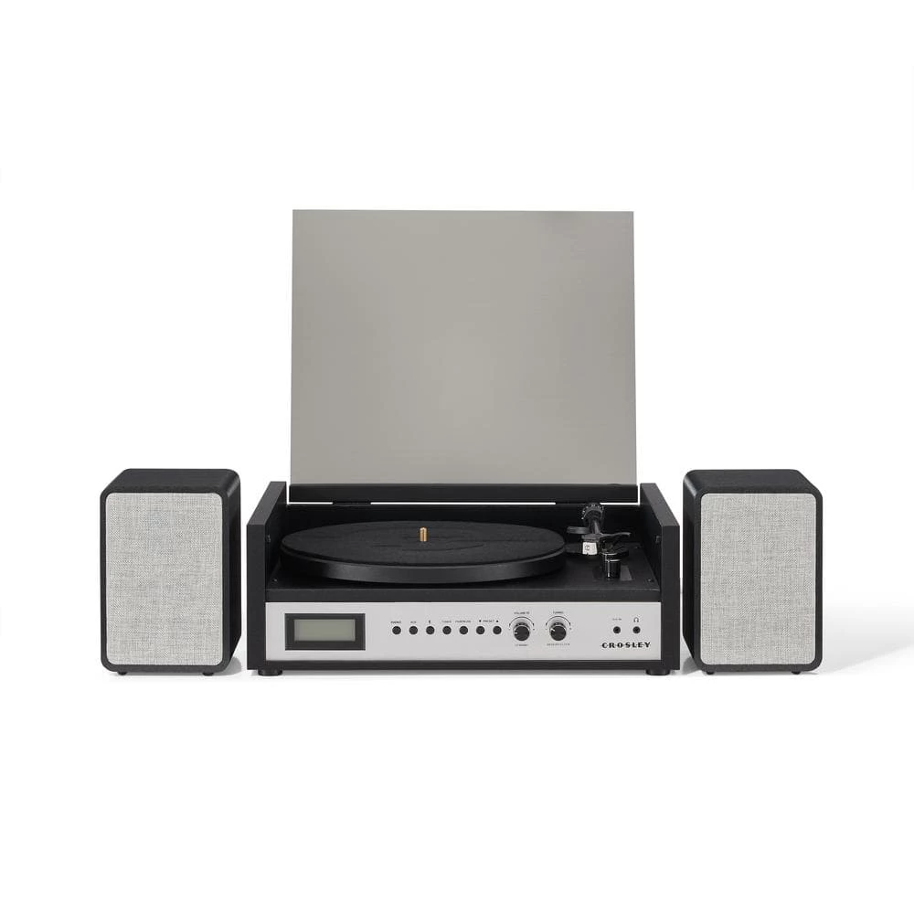 Give your record collection a level up in technical sophistication with the Coda Shelf System. This sleek system was designed with high-end, modern interiors serving as inspiration. Pick out your favorite record, choose between three speeds (33 1/3, 45, and 78 RPM), drop the fully manual tone arm with mounted moving magnetic cartridge onto your vinyl and start listening to music the way the artist intended through matching stereo speakers. When you’re not spinning vinyl on this Instagram-worthy set-up, lower the dust cover and keep it clean while looking chic. Want a break from analog. Connect to the built-in Bluetooth receiver and stream your favorite playlist or switch over to the AM/FM radio to tune in to your local public station.
