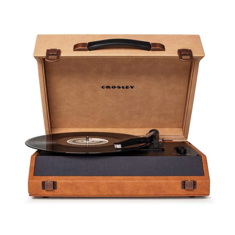 Crosley is switching up the typical portable turntable silhouette with the 2-tone asymmetrical design of the Momento Turntable. Open the lid to reveal the angled built-in stereo speakers and the minimalistic turntable components. 2 knobs control volume and pitch while you can easily toggle between 33 1/3, 45 and 78 RPM with the speed selector switch. The Momento features an aluminum tone arm fitted with a moving magnet cartridge and diamond stylus. Other features include a built-in 45 adapter so you can play your large-hole singles, RCA outputs that easily let you hook the Momento up to other speakers and a Bluetooth receiver so you can listen to your digital music through the Momento’s speakers.