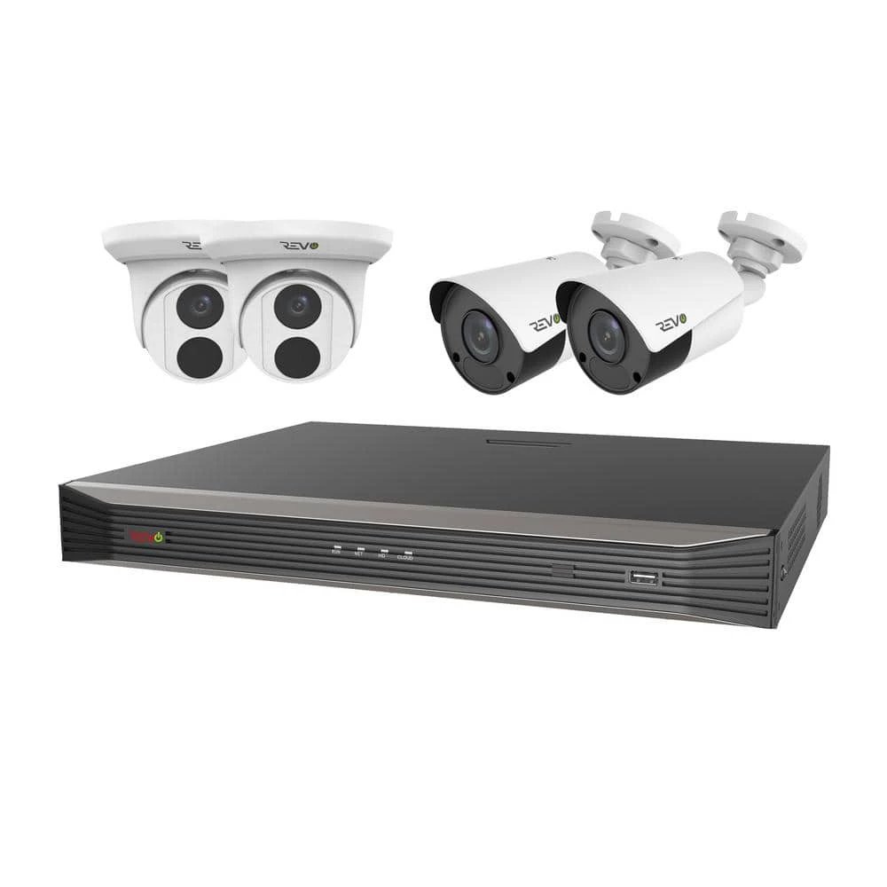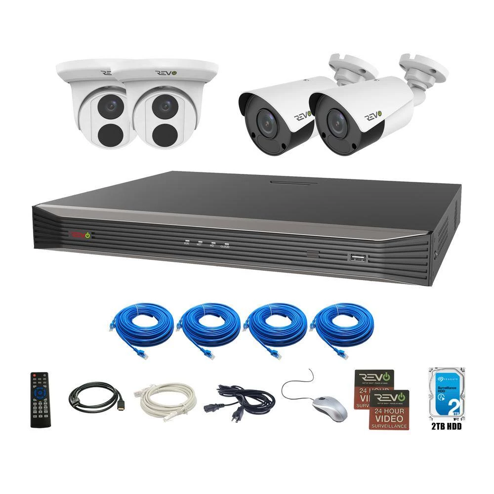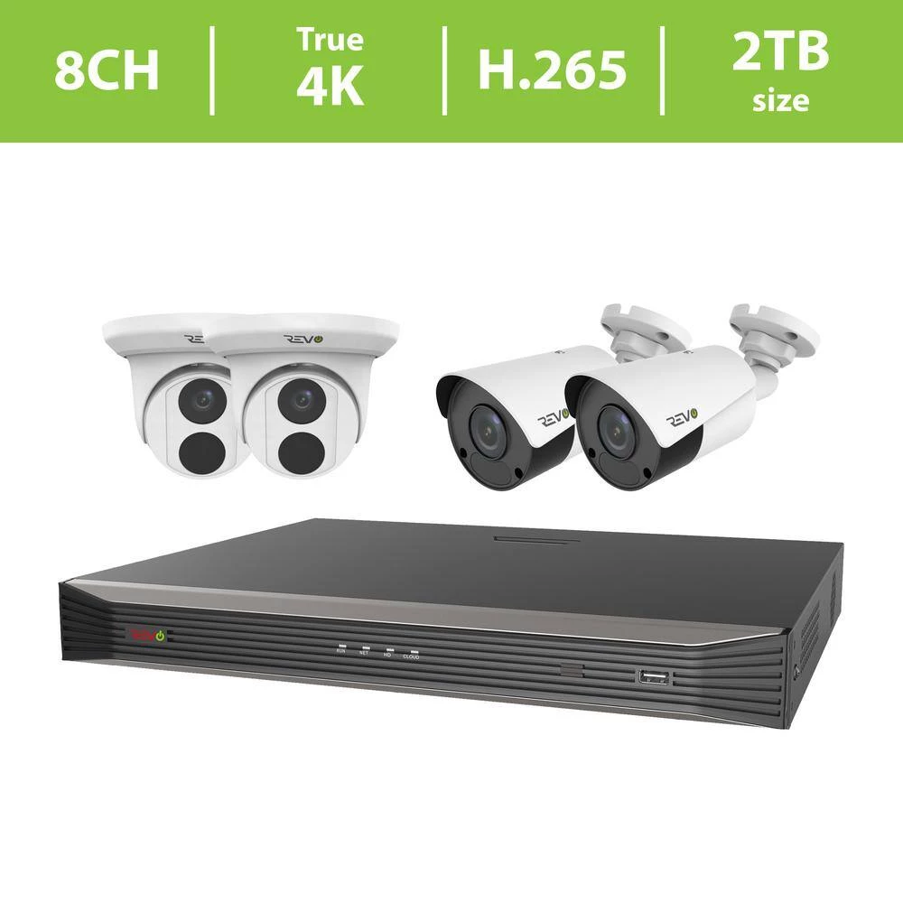 With incredible video quality, ease of use, and powerful networking tools, Revo Ultra is the very best that Revo has to offer. The Revo Ultra’s superb video quality is based on IP technology. The RU82AT2KB2K-2T is a complete plug and play Smart HD surveillance system with 8 channel 4K smart NVR, 2TB and 4x 4K HD Indoor/outdoor Cameras. The Revo ultra 8 channel NVR is powerful featuring state of the art H.265 Compression, up to 4K Recording, 4K video output and 2TB Video Surveillance Grade HDD. The H.265 Indoor/Outdoor cameras feature massive True 4K Sensors, 2 times the resolution of 4MP Cameras. The built-in Professional Grade OSRAM LEDs and IR anti reflection glass strongly illuminate the scene up to an unprecedented 100 in total darkness. The Turret camera feature a 2.8 mm fixed lens which provides a 105° angle of view. The Bullet Camera feature a 4 mm lens which provides an 80° angle of view. The cameras are built for the outdoors capable of handling temperatures as cold -40°F and as hot as 140. View your Revo Ultra 4K cameras from anywhere. Using the Revo Ultra Mobile smartphone app, simply set up an account and then scan your NVRs QR code to begin mobile viewing. Access your Ultra NVR via the web using www.myrevocloud.com, compatible with Internet Explorer. Pre-event recording includes video before motion is detected providing valuable context leading up to the incident. Experience Peace of Mind with the ultimate high resolution IP technology from Revo.