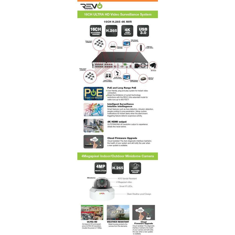 With incredible video quality, ease of use and powerful networking tools, Revo Ultra is the very best that Revo has to offer. Revo Ultra’s unique design complements any home or business. The Revo Ultra’s superb video quality is based on IP technology which brings the power and beauty of digital high definition video right to the heart of your surveillance. The RU162MD8G-3T system features a high powered 16-Channel H.265 NVR, 8-Indoor/Outdoor IR Mini Dome Cameras. The cameras feature 3D Digital Noise Reduction; massive 4-Megapixel Sensors double the resolution of standard 1080p HD. Smart IR LEDs illuminate the scene up to an impressive 100 ft. in total darkness. The cameras are built for the outdoors, handling temperatures as hot as 140°F and as cold as -31°F, rain or shine. View your Revo Ultra 4MP system from anywhere. Using the Revo Ultra Mobile smartphone app simply set up an account and then scans your NVRs QR code to begin mobile viewing. Want to view multiple Revo Ultra units at different locations from a single computer, With Revo EZStation Software, design your own custom layout of which cameras you’d like to view with Video Wall or even lay them out on a custom map of your property with E-Map. Experience Peace of Mind with the ultimate high resolution IP technology from Revo.